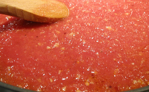 Simmer gently until the tomatoes collapse and the sauce thickens. Crush the tomatoes in the pan with a potato masher to get a smoother sauce. |